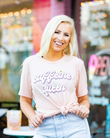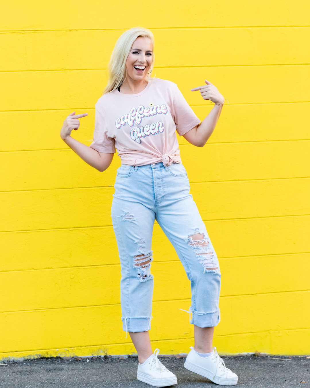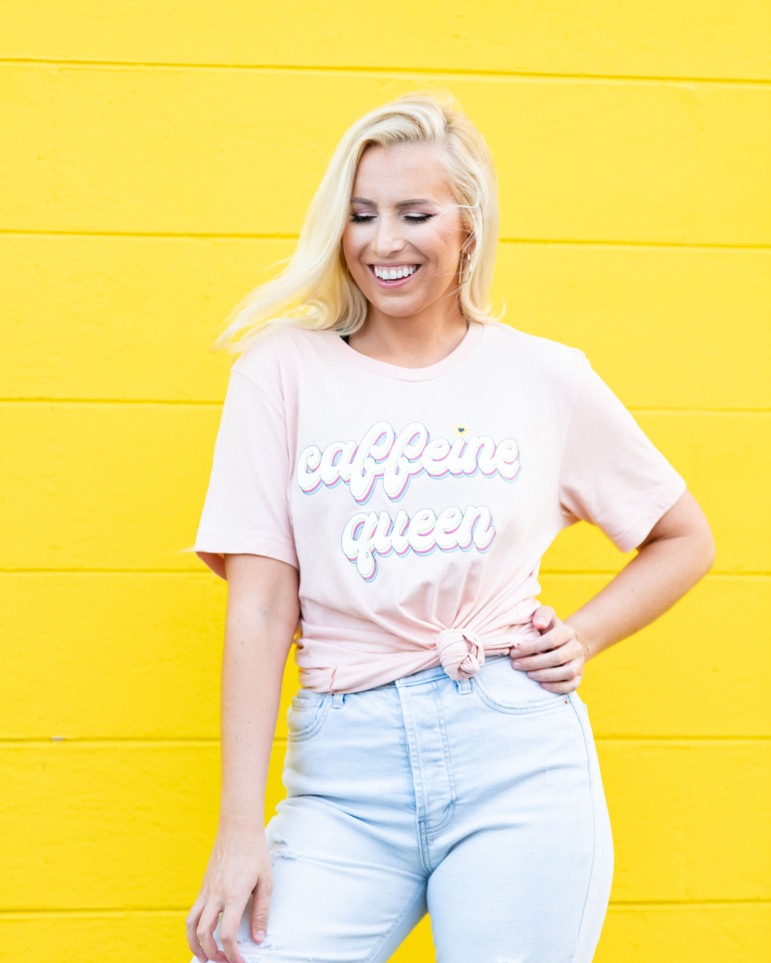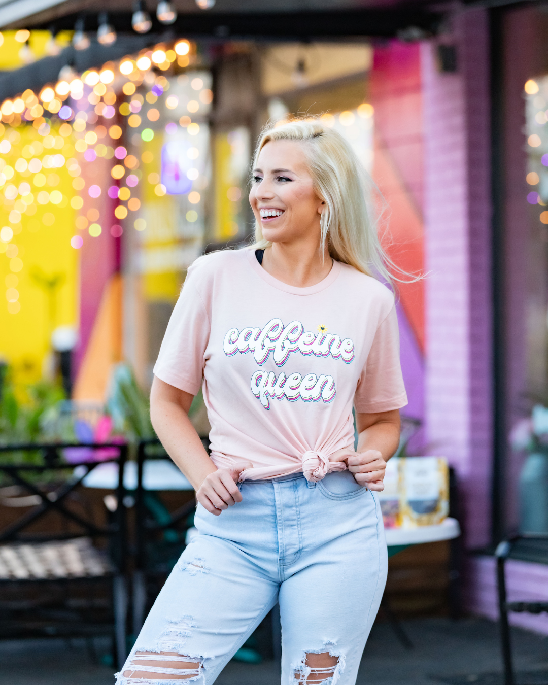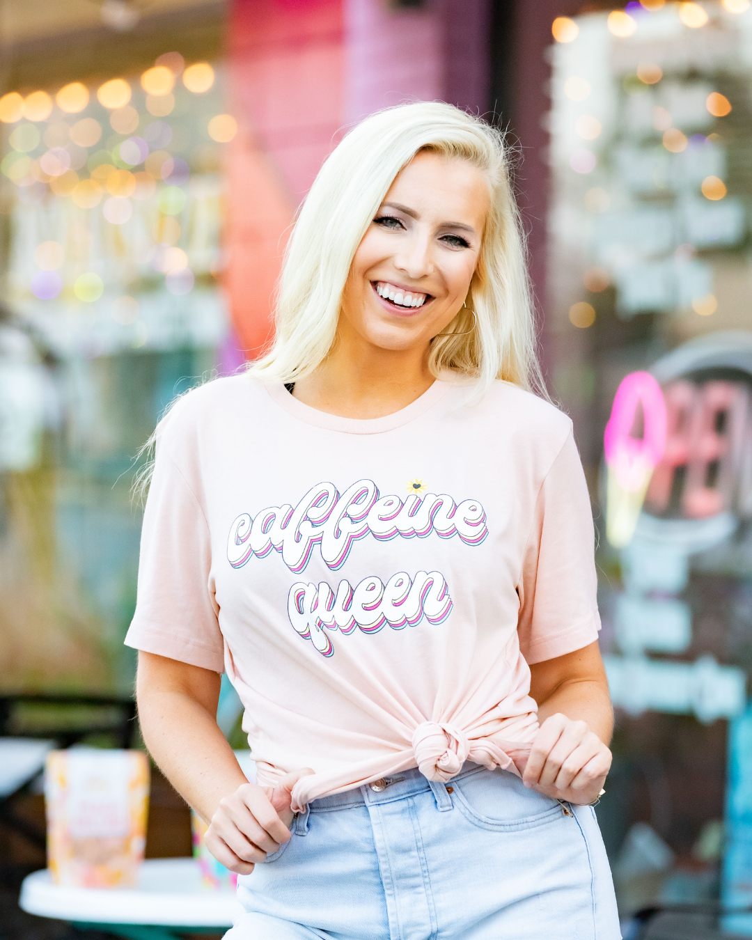 Calling all caffeine queens! Our trendy, soft, retro tee is the perfect way to show your love for coffee and tea. Tie it up, tuck it in, or let it loose with any pair of yoga pants, shorts, pants, or jeans. Machine Washable.