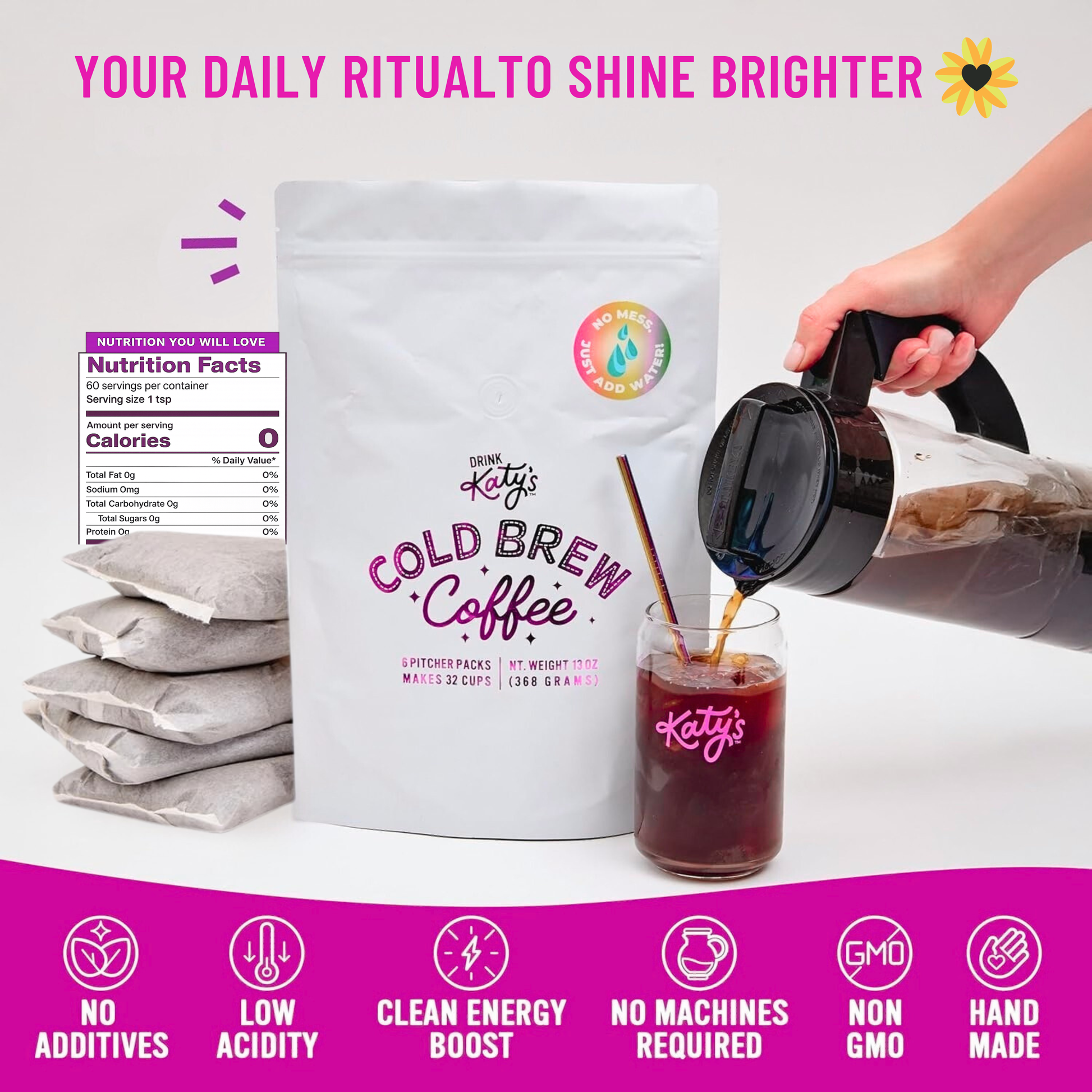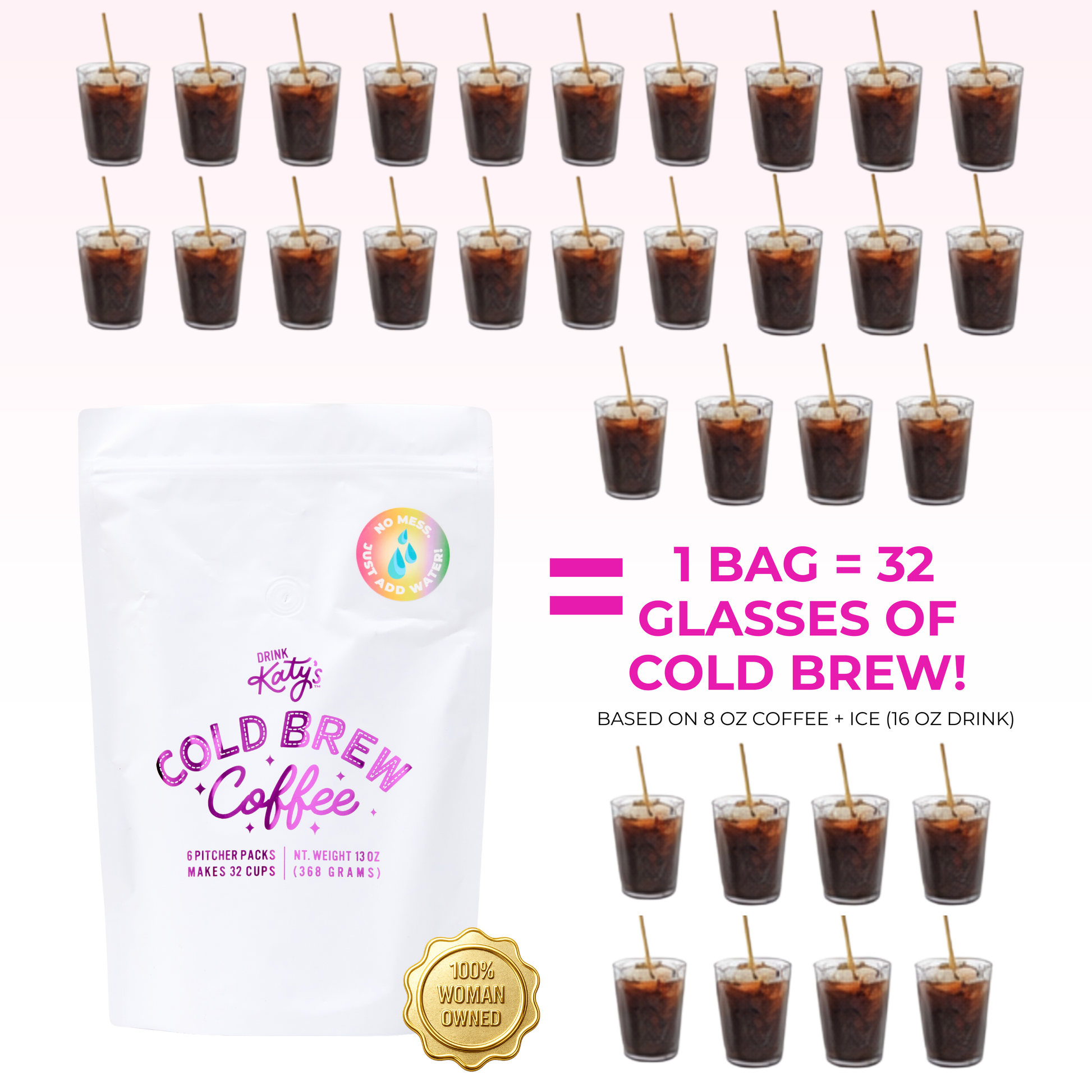 Finally, cold brew coffee that is delicious, smooth, not bitter, healthy, easy to make, leaves no mess, and is better than coffee-shop quality! Be your own barista and meet Katy's cold brew pitcher packs. All you have to do is place our convenient pre-measured filter packs in any container with water, steep for 24 hours, and enjoy! Low acid coffee, high caffeine, stays fresh for two weeks. 6 pitcher packs = 32 cups total.