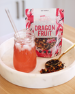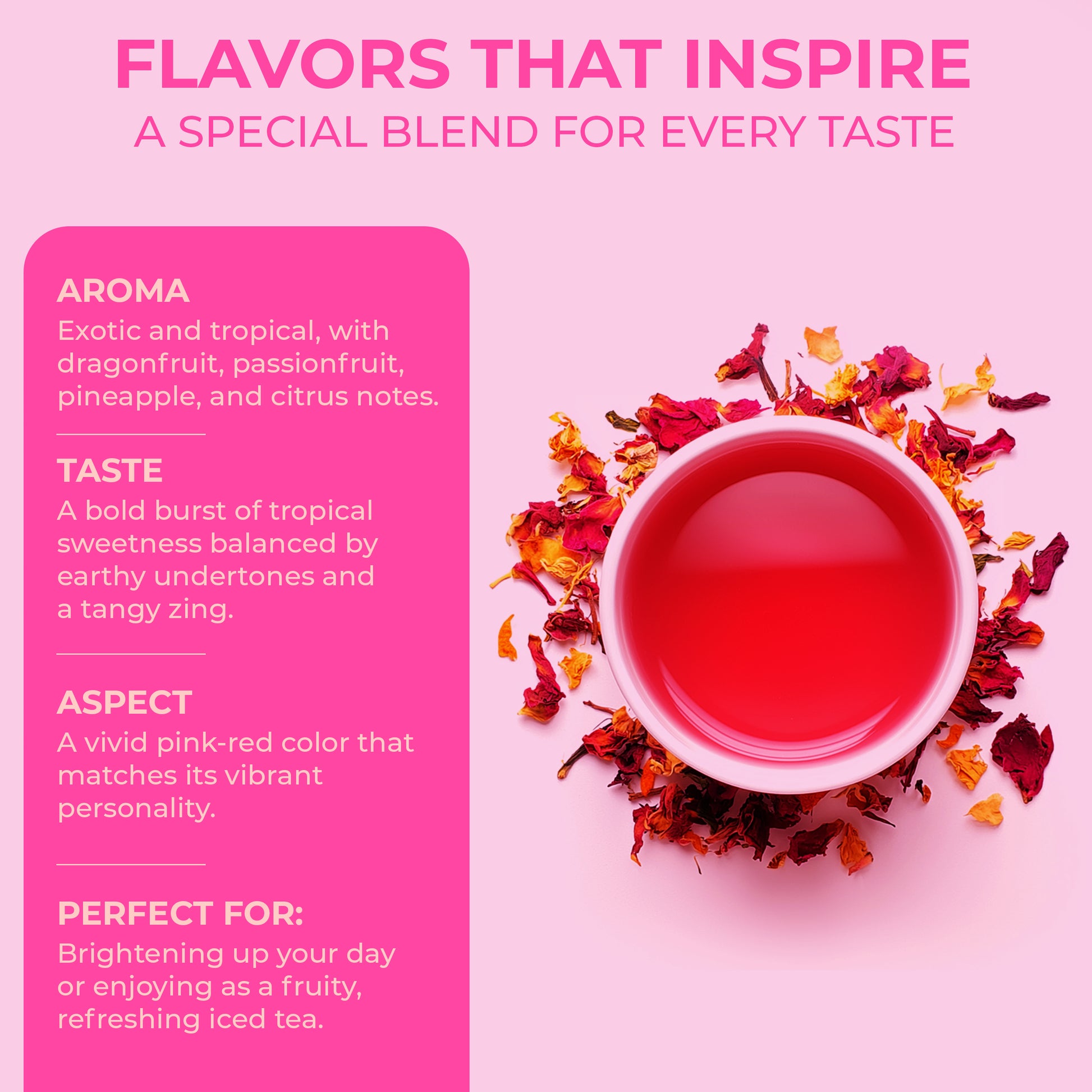 Hibiscus Flowers, Rose Hips, Rose Petals, Marigold Flowers, Lemon Verbena, Apple Pieces, Pineapple Pieces, Strawberry Pieces, Dragonfruit Pieces, Orange Peels, Natural Dragonfruit Flavor