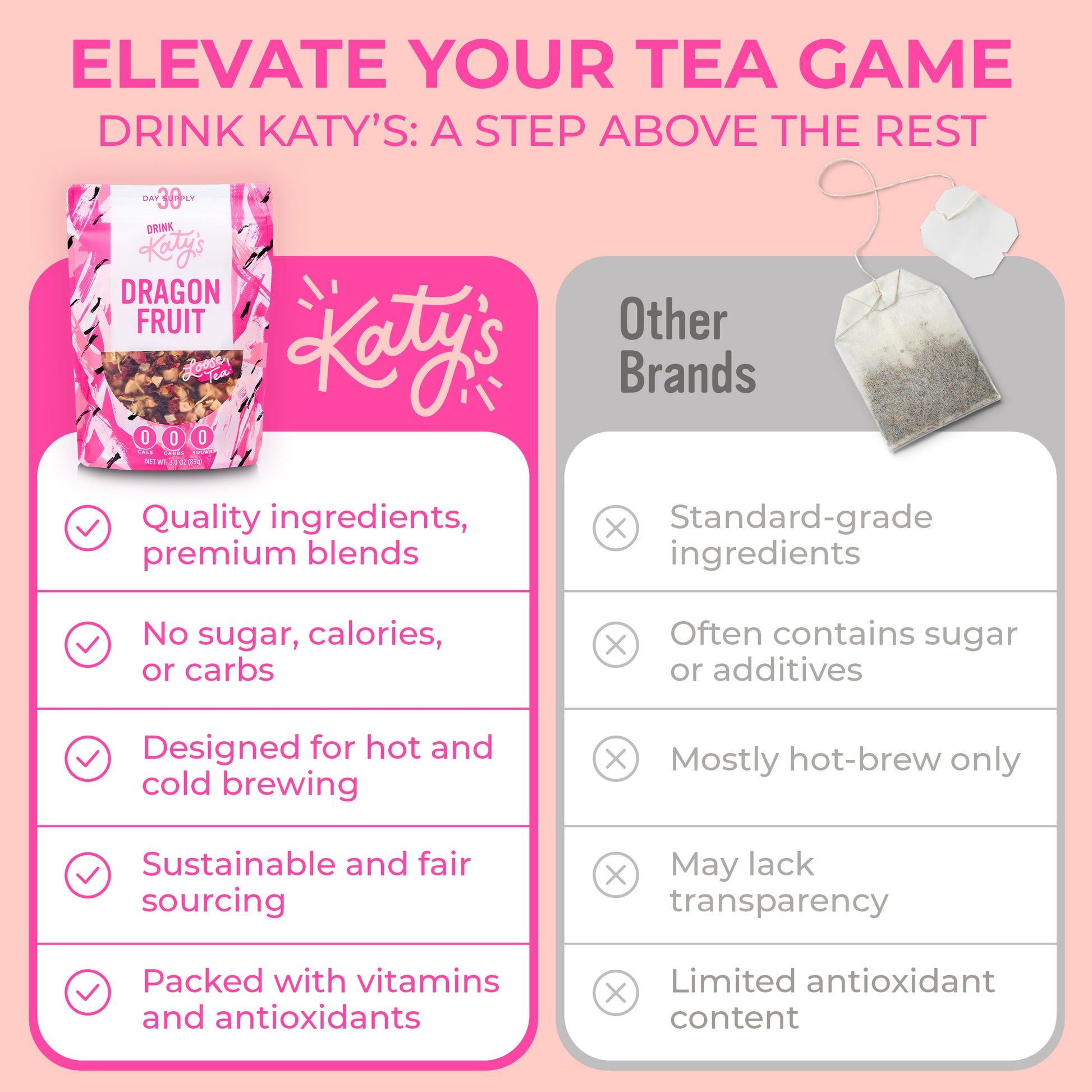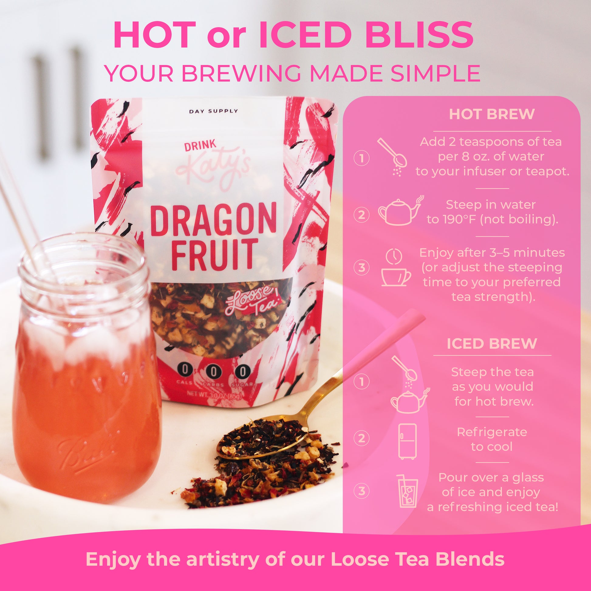 Come to paradise with our Dragonfruit Herbal Loose Tea. A delicious pink tea blend that will transport you to your dream tropical oasis with every sip! 60 teaspoons, 30 day supply. Perfect for hot or cold brew. Zero calories, sugar, and carbs. Caffeine Free & Kid Friendly.